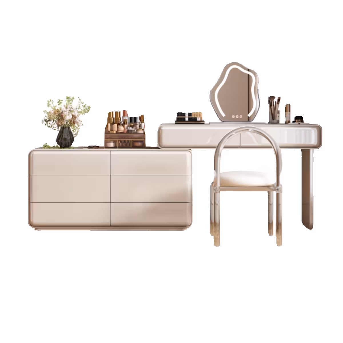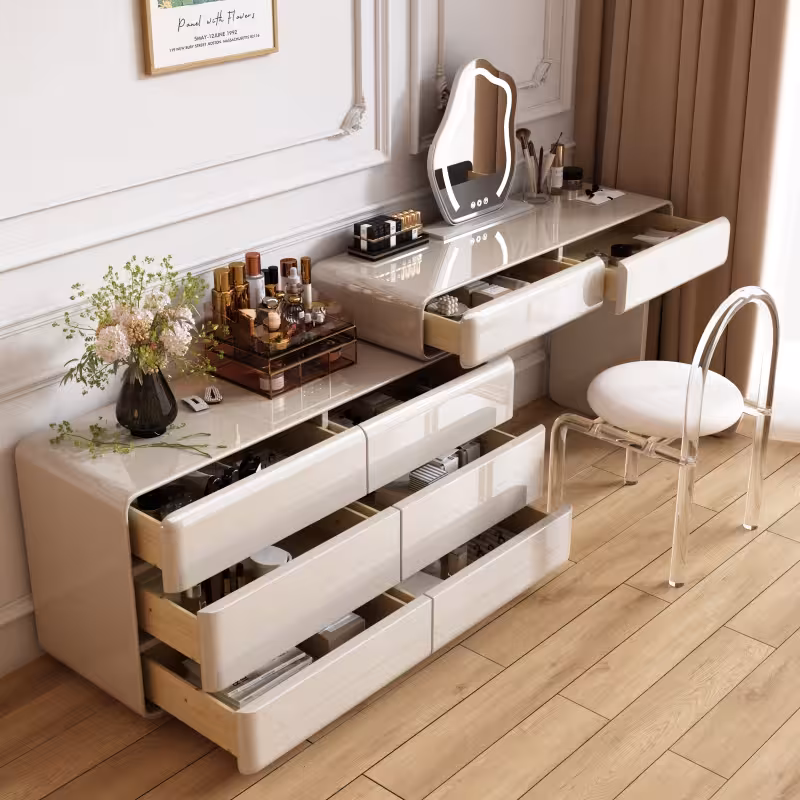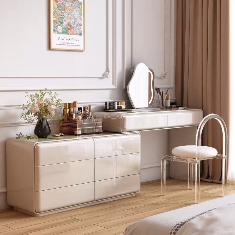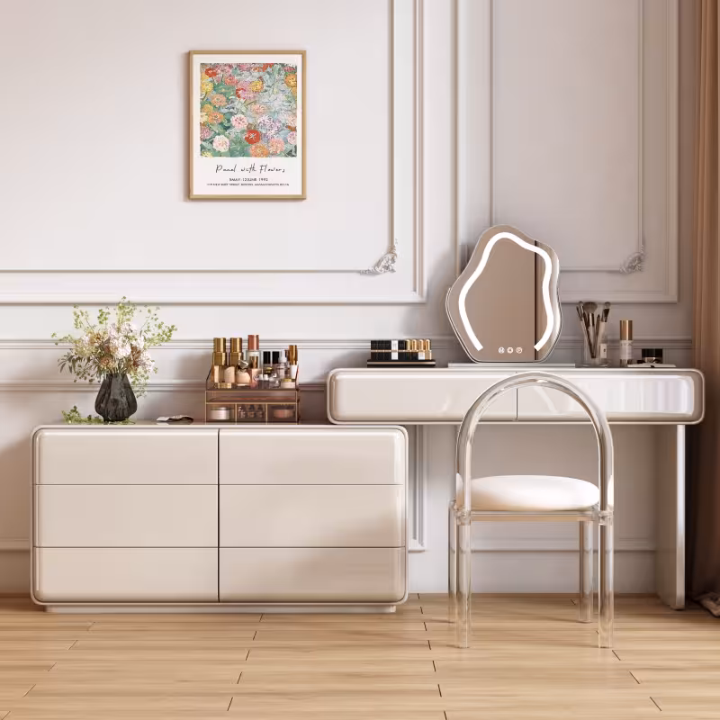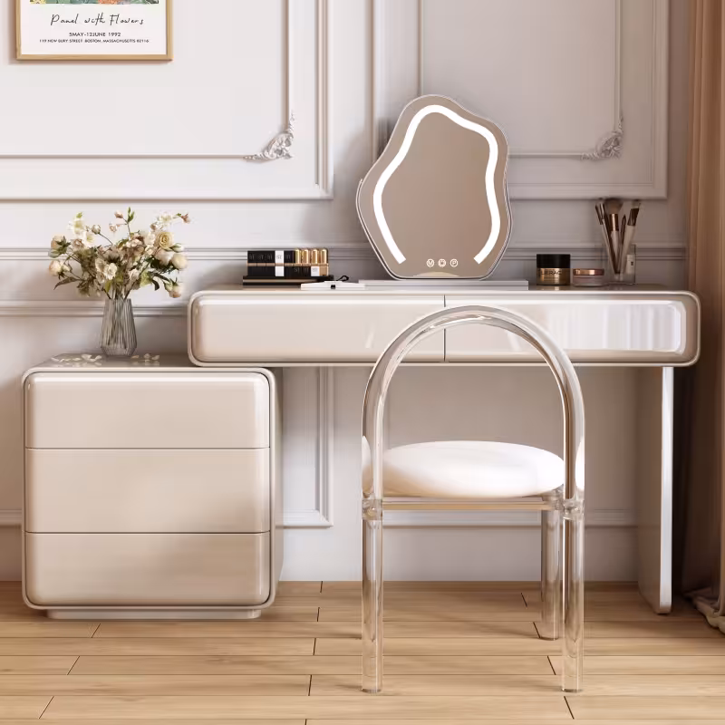 現代梳妝枱完美融合了時尚與實用,其簡約設計不僅提升了空間的美感,還提供了充足的收納空間,方便整理化妝品和配件,無論是早晨的化妝時光,還是夜晚的保養儀式,這款妝台都能提供您舒適的體驗,幫助輕鬆展現自信魅力。