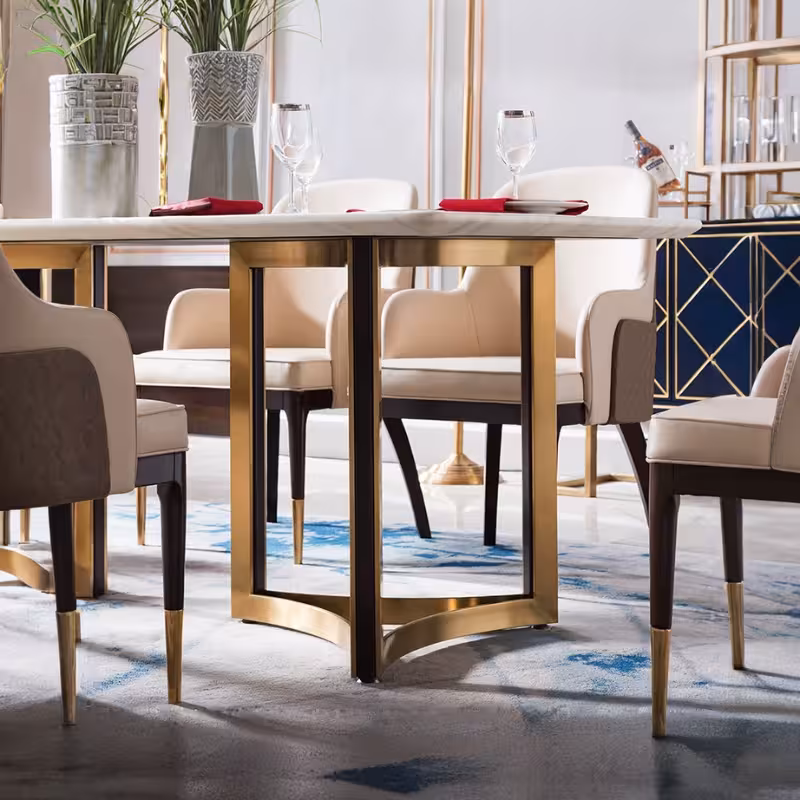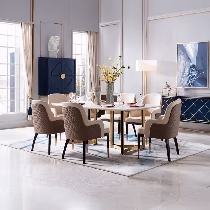 這款餐桌搭配精美椅子和優雅花瓶,完美詮釋了奢華與品味的結合,表面光滑,散發出獨特的光澤,耐磨且易於清潔,確保長久使用,花瓶則為整體增添了一抹生機,適合各種家居風格,讓您的餐廳瞬間提升風格,選擇這款餐桌,享受高端生活的每一刻!
