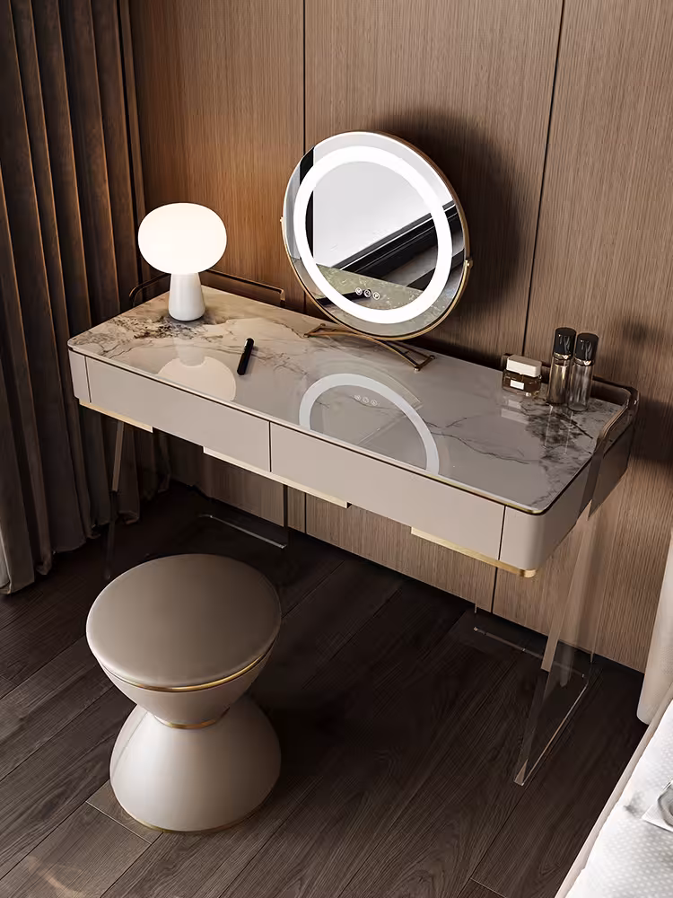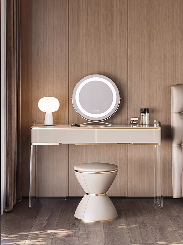 材料 : 實木+亞克力 台面 : 岩板 設計 : 大容量實木儲物抽屉 顏色 : 米白色