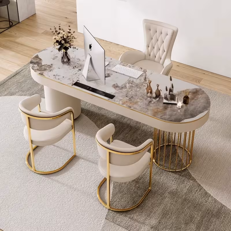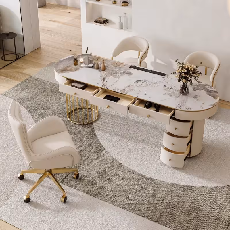 現代辦公室設計,白色桌面與金色裝飾相得益彰,展現出簡約而不失奢華的風格。這款書桌不僅提供寬敞的工作空間,還能為你環境增添一絲優雅。無論是居家辦公或企業使用,都是提升工作效率與美感的理想選擇。