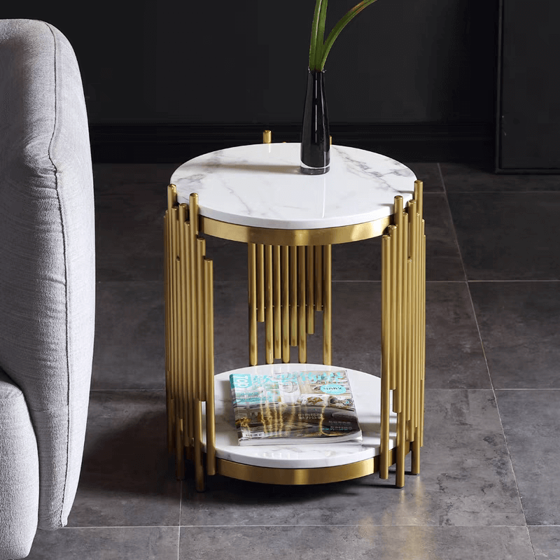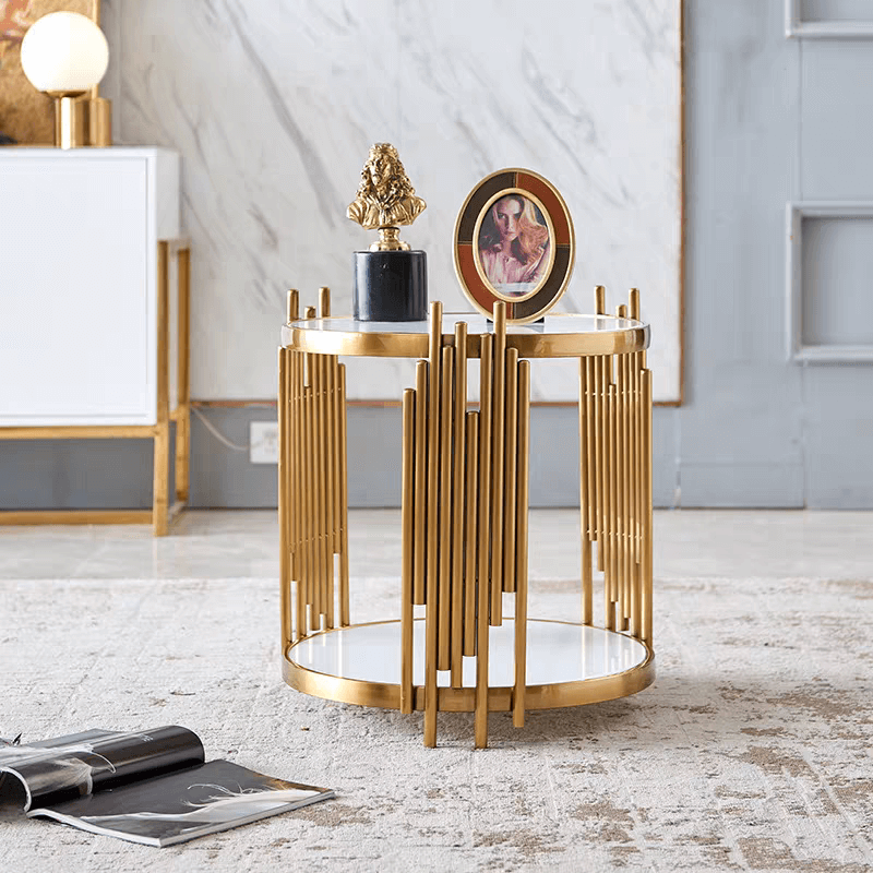 材料: 大理石+不銹鋼/岩板+不銹鋼 檯面: 精巧雙層置物台面 設計: 花架形腳 顏色: 雪山白色
